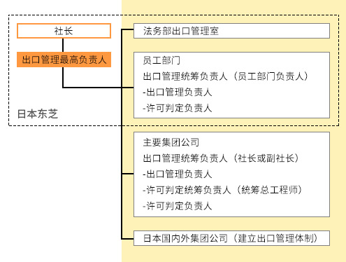 日本東芝設(shè)置“法務(wù)部出口管理室”,在最高負(fù)責(zé)人的領(lǐng)導(dǎo)下,對(duì)“東芝ECCP”的整體運(yùn)營(yíng)工作進(jìn)行管理。在職能部門,由職能部門負(fù)責(zé)人擔(dān)任“出口管理統(tǒng)籌負(fù)責(zé)人”。在集團(tuán)公司內(nèi)部,由社長(zhǎng)擔(dān)任“出口管理統(tǒng)籌負(fù)責(zé)人”,對(duì)出口業(yè)務(wù)進(jìn)行統(tǒng)籌管理。并依據(jù)“東芝ECCP”規(guī)定,建立各自的出口管理體制。